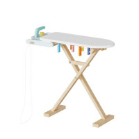 This wooden ironing board toy set includes a mini iron and clothespins, perfect for pretend play.