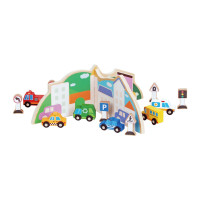This wooden city traffic play set includes cars, signs, and traffic lights, perfect for pretend play and learning.