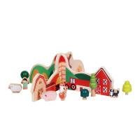 This wooden farm play set features animals, a barn, and accessories, perfect for imaginative play and learning.
